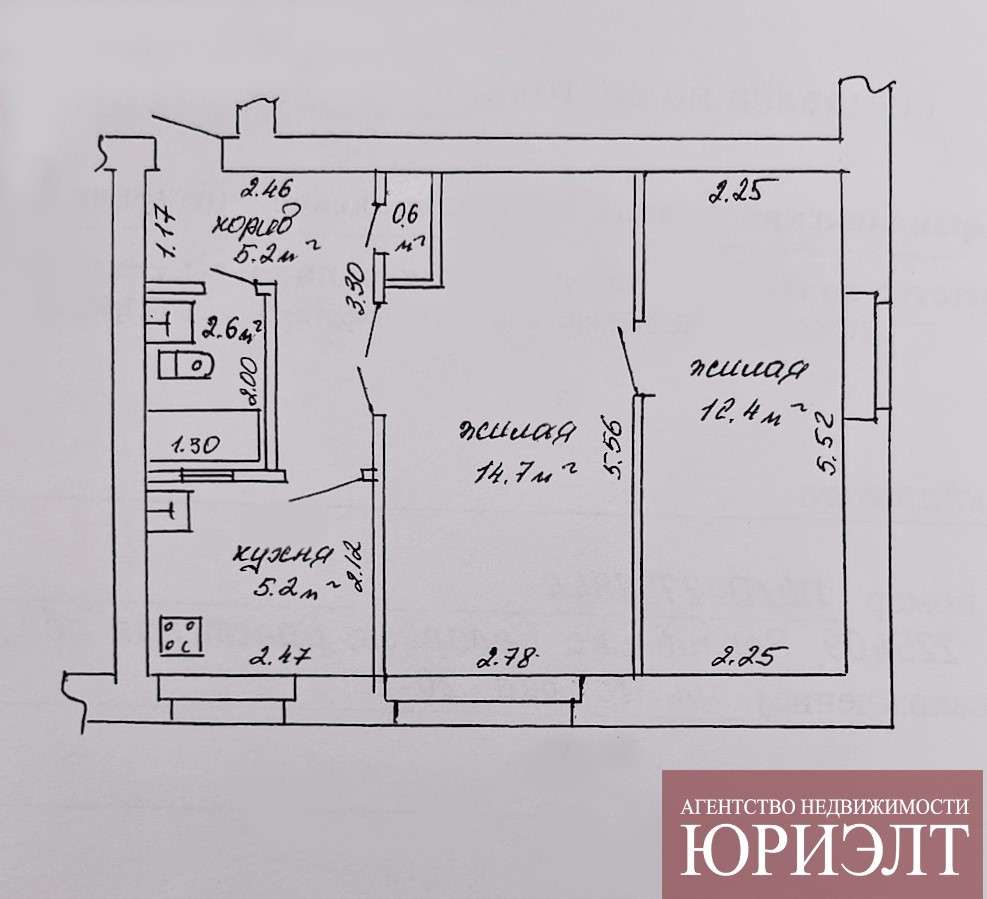 Общая площадь - 40,7 м², жилая площадь - 27,1 м², кухня – 5,2 м², с/у совмещенный уложен плиткой.