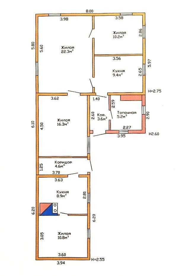 Общая площадь – 91,3 м², жилая – 59,6 м², кухня – 9,4 м².