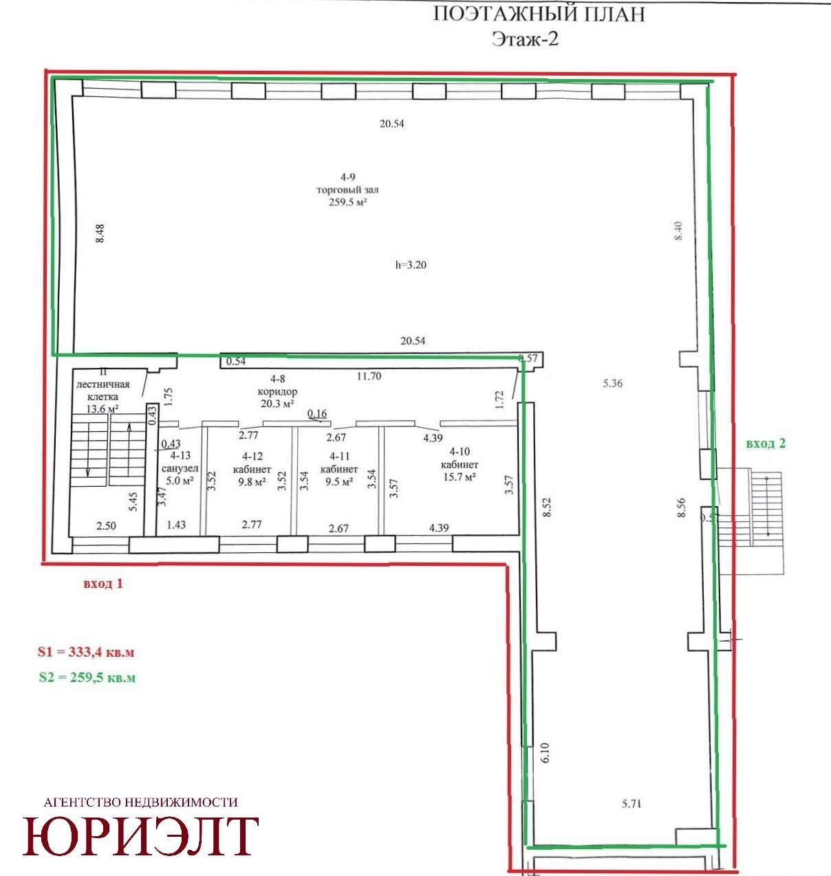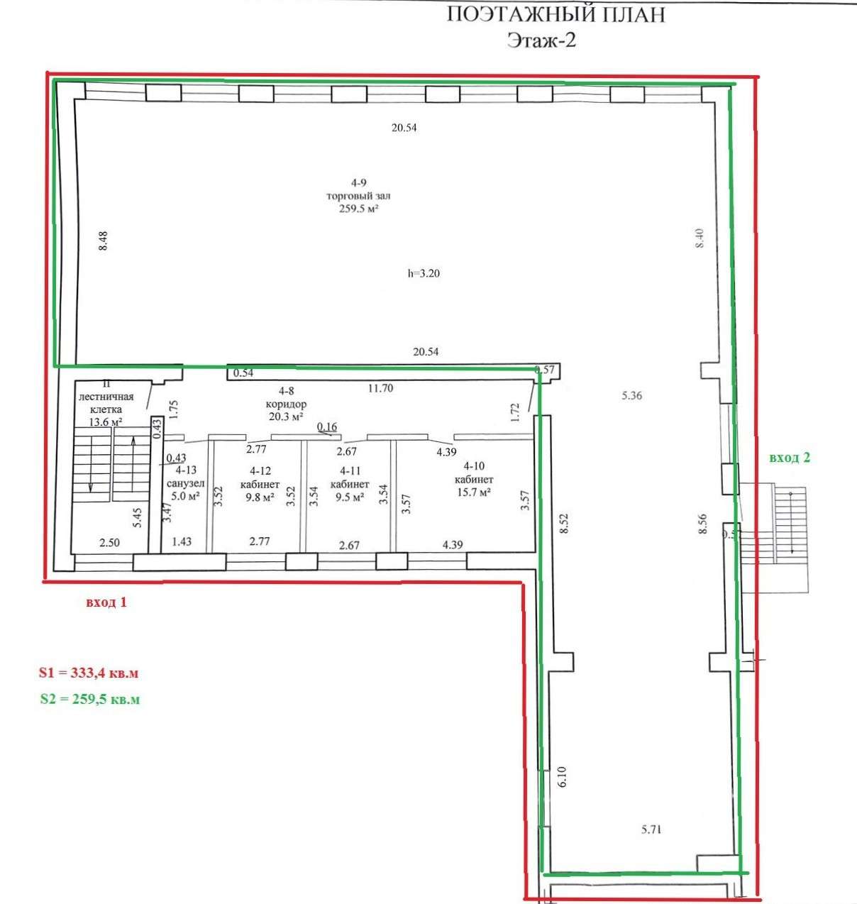 - S1 (см.план) = 333,4 м² ; S2 (см.план) = 259,5 м²